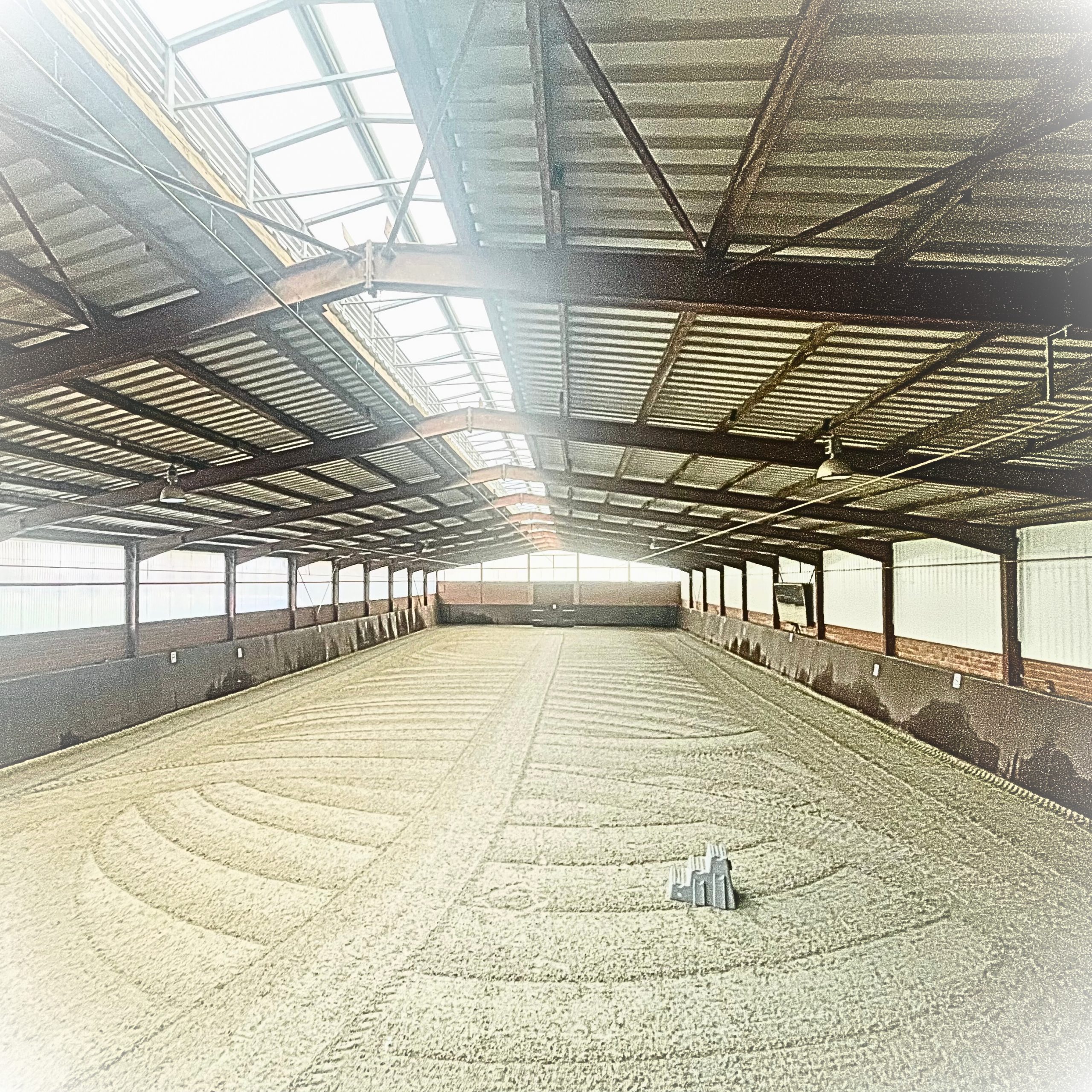 Eine helle Reithalle mit den Maßen 20x55 m, ausgestattet mit Beregnungsanlage, Reitboden aus Sand-Vlies Gemisch und Musikanlage, bietet dir das ganze Jahr über perfekte Trainingsmöglichkeiten.